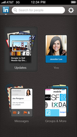 2. Tasks have been organized into credible groups such as Updates, which gives access to a users network updates and top stories from LinkedIn Today; Inbox, which holds invites and messages; You, which gives access to a users profile and connections; and Groups & More which lets users connect with groups and build their network.