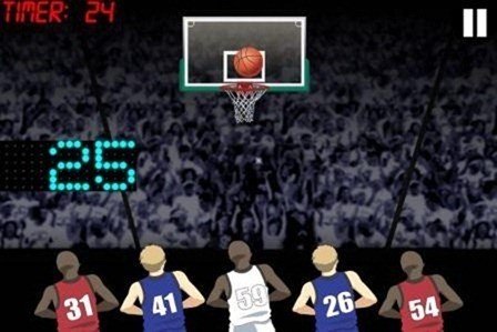 Basketball Hotshots includes 3 game types; Match Play that splits the game into two halves of 30 seconds where you need to get the highest score within that time; Speed Shooter, which requires you to score 50 points to move to the next level where the baskets move faster with each level; and Eliminator where the player is eliminated when he misses the basket and the game is lost when all 5 players are eliminated.
