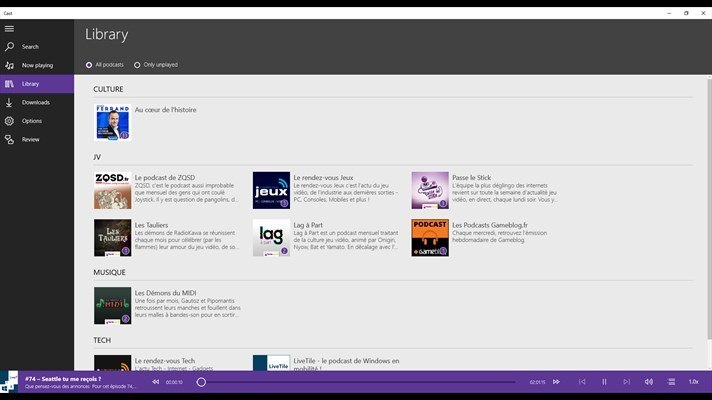 Cast is your definitive tool for managing your audio podcasts on your desktop, tablet or mobile. Your library is synchronized over your devices. You can organize your collection and use it everywhere you are!